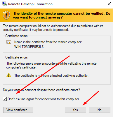 - Na tela seguinte, vai aparecer um aviso informando que não foi possível verificar o certificado. Você pode habilitar a opção “Não perguntar novamente sobre conexões com este computador” e finalmente ir em Sim.